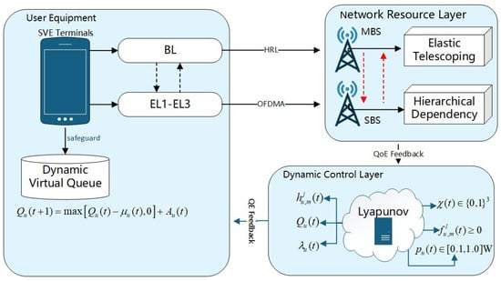 The system architecture comprises three functional components: a mobile client, a network resource layer, and a dynamic control layer [19]. The mobile client implements SVC-based decomposition of video streams into the base layer and enhancement layers with hierarchical dependencies, and establishes a dynamic virtual queue to enable real-time feedback of task backlog status. The base layer is preferentially offloaded to macro base stations through ultra-reliable low-latency communication (URLLC) links, while the enhancement layers dynamically select Orthogonal Frequency Division Multiple Access (OFDMA) sub-bands for transmission to small base stations based on channel state prediction [20]. The network resource layer integrates heterogeneous computing resource pools from macro/small base stations, performs on-demand resource allocation through elastic scaling mechanisms, and enforces layered dependency constraints to ensure video transmission integrity [21]. The dynamic control layer incorporates Lyapunov optimization modules to jointly optimize offloading policies, resource allocation weights, and power control parameters in real time, achieving dynamic balance between user experience quality maximization and queue stability through drift-plus-penalty minimization [22].