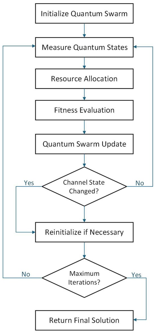 Figure 2 outlines HQPSO’s workflow: after initializing the quantum-bit matrix and setting pbest/gbest, the algorithm measures quantum states to obtain binary offloading decisions and then allocates resources and computes system utility under latency and energy penalties. It evaluates fitness, refreshes pbest/gbest, and updates the swarm by adjusting and . If a channel-state change is detected, part of the swarm is reinitialized; otherwise, the loop returns to state measurement. The procedure repeats until the iteration budget is exhausted or convergence is achieved, at which point gbest and the associated system utility are returned.The core operations of quantum state measurement, resource allocation, and fitness evaluation are defined in Algorithm 1, which serves as the functional backbone for HQPSO’s iterative optimization process.