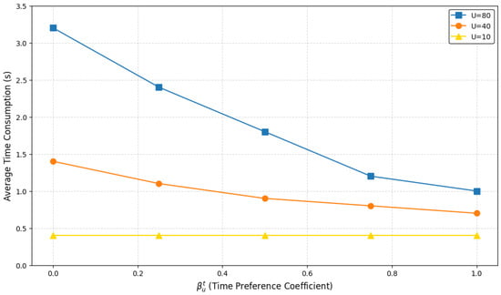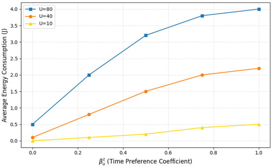 Figure 3 and Figure 4 illustrate the variations in users’ average time consumption and average energy consumption with changes in preference. It can be observed that when altering the user’s preference for time (with a value range of , the user’s preference for energy also changes, leading to corresponding adjustments in all users’ average time and energy consumption. As increases, the average latency decreases gradually, but this is accompanied by higher energy consumption. Additionally, as the number of users continues to rise, there is an upward trend in both the average latency and energy consumption per user. The primary reason for this phenomenon is that when a large number of users compete for system resources, the probability of each user achieving high performance during the offloading process diminishes accordingly.