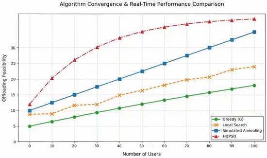 The advantages of the HQPSO algorithm in hyper-dynamic environments stem from its hybrid quantum particle swarm optimization framework. By incorporating quantum-inspired behaviors to enhance global search capabilities, it effectively mitigates the local optima trapping issue inherent in conventional PSO while overcoming the myopic decision-making defects of GREEDY and LS algorithms. The dynamic parameter adaptation mechanism enables real-time search strategy adjustments, rapidly focusing on promising solution regions during user traffic spikes, offering greater flexibility compared to SA’s fixed cooling schedule. The performance degradation of the SA algorithm after 50 users is primarily due to its fixed cooling schedule, which causes rapid temperature decreases. As the number of users increases, the cooling rate becomes too aggressive, resulting in insufficient exploration of the solution space and leading to premature convergence on suboptimal solutions. The elite preservation strategy significantly accelerates convergence speed, with solution feasibility reaching 25 for 50 users (SA only achieves 18). Meanwhile, HQPSO eliminates LS’s convergence delay and GREEDY’s load balancing limitations, achieving superior real-time performance with reduced computational overhead, making it particularly suitable for highly dynamic scenarios.