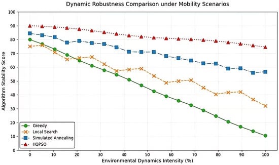 As demonstrated in the figure, the HQPSO algorithm significantly outperforms its counterparts: when environmental dynamic strength escalates from 0% to 100%, its stability performance metrics remain consistently within the high range of 80–90 with negligible fluctuations. In stark contrast, conventional algorithms exhibit pronounced performance degradation GREEDY plummets from 60 to 20, LS declines from 70 to 30, and SA, though relatively better, still drops from 75 to 50. This performance gap becomes particularly pronounced beyond 50% dynamic strength, where HQPSO achieves 2–4 times higher scores than competing algorithms. These results validate that HQPSO effectively addresses traditional algorithms’ performance deterioration in dynamic environments through quantum behavior optimization and dynamic parameter adaptation mechanisms. The algorithm’s unique adaptive capability establishes it as the most robust solution for hyper-dynamic scenarios.