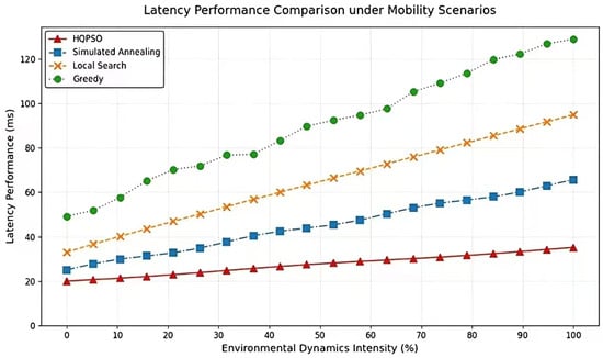 Figure 7 demonstrates the delay performance comparison among four algorithms in hyper-dynamic environments. As illustrated, when environmental dynamic strength increases from 0% to 100%, HQPSO maintains consistently low latency within 20–40 ms with the smoothest growth curve, indicating its architectural robustness against environmental disturbances. Whereas competing algorithms exhibit dramatic fluctuations: SA surges from 20 ms to 80 ms, LS deteriorates from 30 ms to 100 ms, and GREEDY performs worst with latency skyrocketing to 120 ms. Particularly beyond the critical 50% dynamic threshold, HQPSO achieves merely 1/3 latency of GREEDY and demonstrates 50% lower delay than SA, the second-best performer. This superiority originates from HQPSO’s quantum behavior optimization mechanism, which dynamically maintains optimal path planning during abrupt environmental changes through real-time particle swarm strategy adaptation and elite preservation, while conventional algorithms suffer from fixed-parameter rigidity and local optima trapping. These results substantiate HQPSO as the optimal solution for guaranteeing ultra-low latency services in high-mobility scenarios.