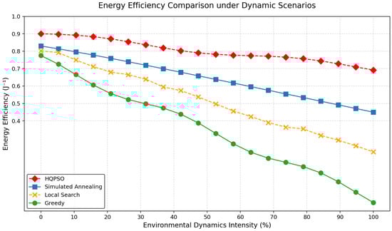 Figure 8 presents a comparative analysis of energy efficiency for various algorithms under highly dynamic scenarios, highlighting the superior performance of the HQPSO algorithm. As depicted, as the environmental dynamism increases from 0% to 100%, HQPSO (red diamond) consistently maintains the highest energy efficiency (0.75–0.85 ), with a minimal decline of only 0.1 , demonstrating the most stable and gentle curve. In contrast, other algorithms exhibit significant performance degradation: simulated annealing (blue square) drops from 0.8 to 0.55 , local search (orange cross) decreases from 0.75 to 0.45 , and the greedy algorithm (green circle) performs the worst, plummeting from 0.7 to 0.35 . Notably, when the environmental dynamism exceeds 60%, the energy efficiency advantage of HQPSO becomes even more pronounced, achieving over twice the efficiency of the greedy algorithm and approximately 30% higher than the second-best simulated annealing algorithm. This significant advantage is attributed to the unique quantum behavior optimization mechanism of the HQPSO algorithm, which intelligently adjusts particle swarm search strategies and dynamic parameters for self-adaptation, effectively reducing unnecessary computational overhead and maintaining optimal energy utilization even in rapidly changing environments.