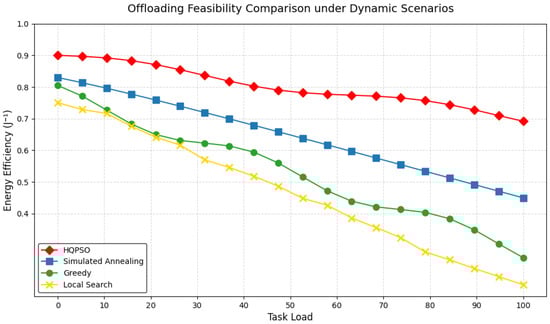 Figure 9 demonstrates the offloading feasibility comparison among four algorithms in hyper-dynamic environments. As illustrated, the HQPSO algorithm (red diamonds) demonstrates superior stability in energy efficiency metrics, maintaining values within 0.8–0.9 across increasing task loads with minimal fluctuations. Whereas the competing algorithms exhibit significant performance degradation: simulated annealing (blue squares) declines from 0.85 to 0.65, GREEDY (green dots) deteriorates from 0.8 to 0.55, and LS (yellow forks) performs worst, plummeting from 0.75 to 0.45. Notably, in the high-load interval (60–100), HQPSO’s energy efficiency advantage becomes more pronounced, achieving higher values than suboptimal SA and nearly double that of LS. This sustained high performance originates from HQPSO’s quantum behavior optimization mechanism, which dynamically adjusts particle swarm search strategies and implements intelligent resource allocation to overcome computational bottlenecks in high-load conditions while ensuring optimal offloading decisions. Moreover, the proposed HQPSO-based joint offloading and resource allocation scheme outperforms conventional GREEDY and LS algorithms in overall performance gains.