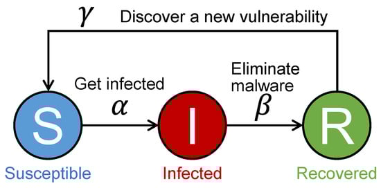 Consequently, the awareness of security issues has been increasing, and many approaches have been proposed to enhance security and reliability in communication systems, such as an intrusion detection-embedded chaotic encryption method [5]. Furthermore, to analyze and mitigate the risk of malware propagation, various epidemic models based on simulation or mathematical frameworks have been proposed, by drawing inspiration from human epidemic models such as the Susceptible–Infected–Recovered–Susceptible (SIRS) model [6]. As an epidemic model for analyzing the propagation dynamics of Bluetooth-based worms in smartphone environments, Gonzalez et al. [7] proposed a simulation-based spatio-temporal model that captures the movement behavior of mobile hosts. The application of such epidemic models offers an effective approach for mitigating malware infection threats. Although simulation-based models evaluate infection dynamics through simulation experiments, they often lack mathematical tractability. This limits theoretical insight and makes it difficult to generalize findings across different parameter settings. Therefore, we are motivated to develop a deterministic model that provides a structured basis for theoretical investigation. In particular, the SIRS epidemic model provides a suitable macroscopic framework, as it captures the aggregate, long-term dynamics of malware diffusion rather than the fine-grained behavior of a single malware instance.