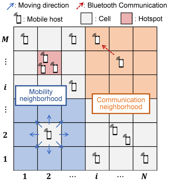 A finite set of mobile hosts is distributed over this grid. Each host resides in one of the cells and is allowed to probabilistically move to one of the cells in the mobility neighborhood . Similarly, a host located at cell can communicate with other hosts within its communication neighborhood . We define the position of a host at time t () as , where denotes the cell in which the host resides. Here, always denotes a cell index in the grid, so the host’s location is tracked only at the cell level, which serves as an approximation of its actual physical position. A mobile host located in cell can move to its next position by selecting one of the mobility neighborhood based on the movement strategy defined later. For example, if host h at cell moves to the right at time t, then , where we assume instantaneous movement between cells. State transitions of each host at cell occur according to the following rules: