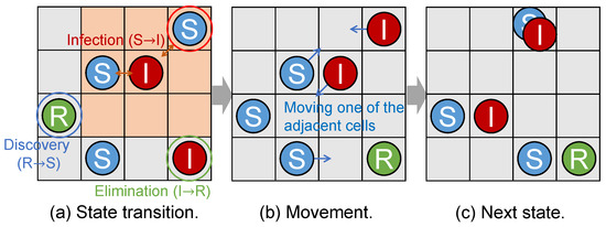 Figure 3 illustrates an example of state transition process. In this example, a susceptible host becomes infected by contact with an infected host in one of its neighboring cells. Additionally, an infected host eliminates the malware, and a recovered host becomes susceptible again due to the discovery of a new vulnerability (Figure 3a). These hosts then transition to the I, R, and S states, respectively (Figure 3b). Furthermore, some hosts move to one of their adjacent cells (Figure 3b,c).