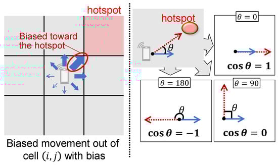 In the proposed model, mobile hosts tend to move in the direction of nearby hotspots as illustrated in Figure 4. As shown in the figure, the degree of movement bias depends on the angle between the host’s movement direction and the direction toward nearby hotspots. This directional preference is quantified using the cosine of the angle , where indicates the direction is exactly toward the hotspot, and indicates it is in the opposite direction. In particular, we employ cosine similarity to determine the directional preference, i.e., the movement probabilities to adjacent cells. As discussed in Section 2.3, cosine similarity has been used in human mobility models and can also be applied to malware propagation on mobile hosts.