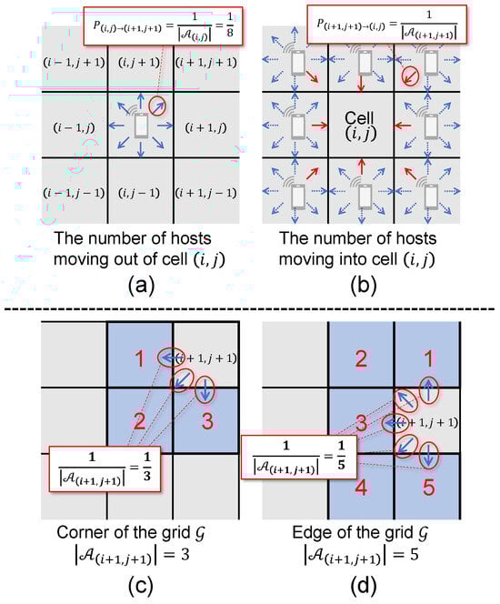 In the example shown in Figure 5, the probability that a host located in cell moves to cell is (Figure 5a). This is because the size of the mobility neighborhood is 8. Furthermore, the probability of moving from cell to cell depends on . As illustrated in Figure 5c,d, if cell is located at a corner of the grid , then (Figure 5c), and if it is on an edge of the grid, then (Figure 5d); otherwise,