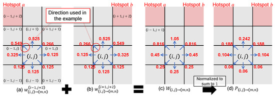 where denotes a small constant to avoid division by zero. With this cosine similarity, the cosine similarity-based weight in (9), representing the directional weight from cell to with respect to hotspot , is given by