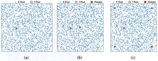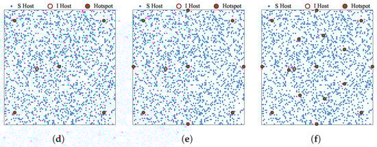 As shown in Figure 10a, when no hotspots are present, the infection spreads slowly and stabilizes at a relatively low level. In this case, since host movement is completely random, spatial convergence does not occur, and contacts between infected and susceptible hosts are limited. Figure 10b–f show that when one or more hotspots are introduced, the infection spreads more quickly and reaches a higher peak. Hotspots promote the local aggregation of hosts, increasing density and making transmission easier. When four or more hotspots are placed (Figure 10c–f), the infection dynamics become more complex: multiple peaks appear, and the total number of infected hosts increases further. These results suggest that having multiple attractive points leads to repeated clustering and sustained propagation in different areas.
