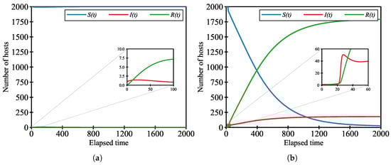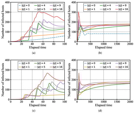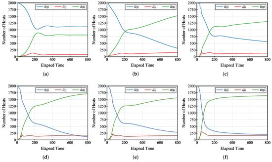 We then investigate how the number and spatial distribution of hotspots affect malware propagation dynamics. Figure 10 shows the number of hosts in each state as a function of the time elapsed, where the infection rate . The hotspot configurations in Figure 10a–f correspond to the initial states shown in Figure 7a–f, respectively.