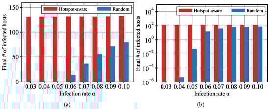 Figure 9 presents the number of infected hosts at 500 time units for various values of the infection rate ranging from 0.03 to 0.1, comparing the proposed hotspot-aware movement strategy with the conventional random movement model. In both Figure 9a,b, the horizontal axis represents the infection rate , while the vertical axis shows the number of infected hosts at a fixed time point. Figure 9a uses a linear scale to show absolute differences in infection counts, whereas Figure 9b adopts a logarithmic scale to better highlight behavior under low-infectivity conditions.