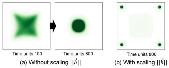 Another limitation lies in the design of the cosine-similarity-based mobility weight. In the current formulation in (10), the term preserves a baseline random movement, and the inverse of the Euclidean norm serves as a simple distance scaling factor. To illustrate the impact of this distance scaling, we compare results with and without in (10) (see Figure 12 where hotspots are located at the four corners). As shown in Figure 12a, without distance scaling, hosts move toward hotspots with equal strength regardless of their location. Consequently, instead of moving toward the four hotspots, all hosts converge near the center. In contrast, with distance scaling (Figure 12b), hosts tend to cluster around the hotspot regions.