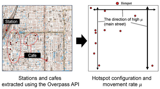 Real-world locations of hotspots (left) and their corresponding positions on a simulation grid (right). The hotspot data, extracted using the Overpass API, include cafes and stations around a selected urban area. Based on this mapping, direction-specific movement rates can be adjusted to reflect urban structures such as roads.