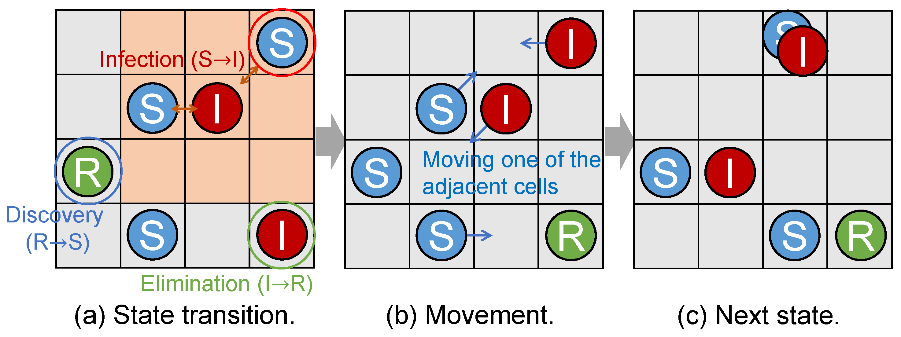 - An infected host located at cell infects a susceptible host located in its neighborhood according to a Poisson process with the infection rate . The susceptible host transitions to the infected state.