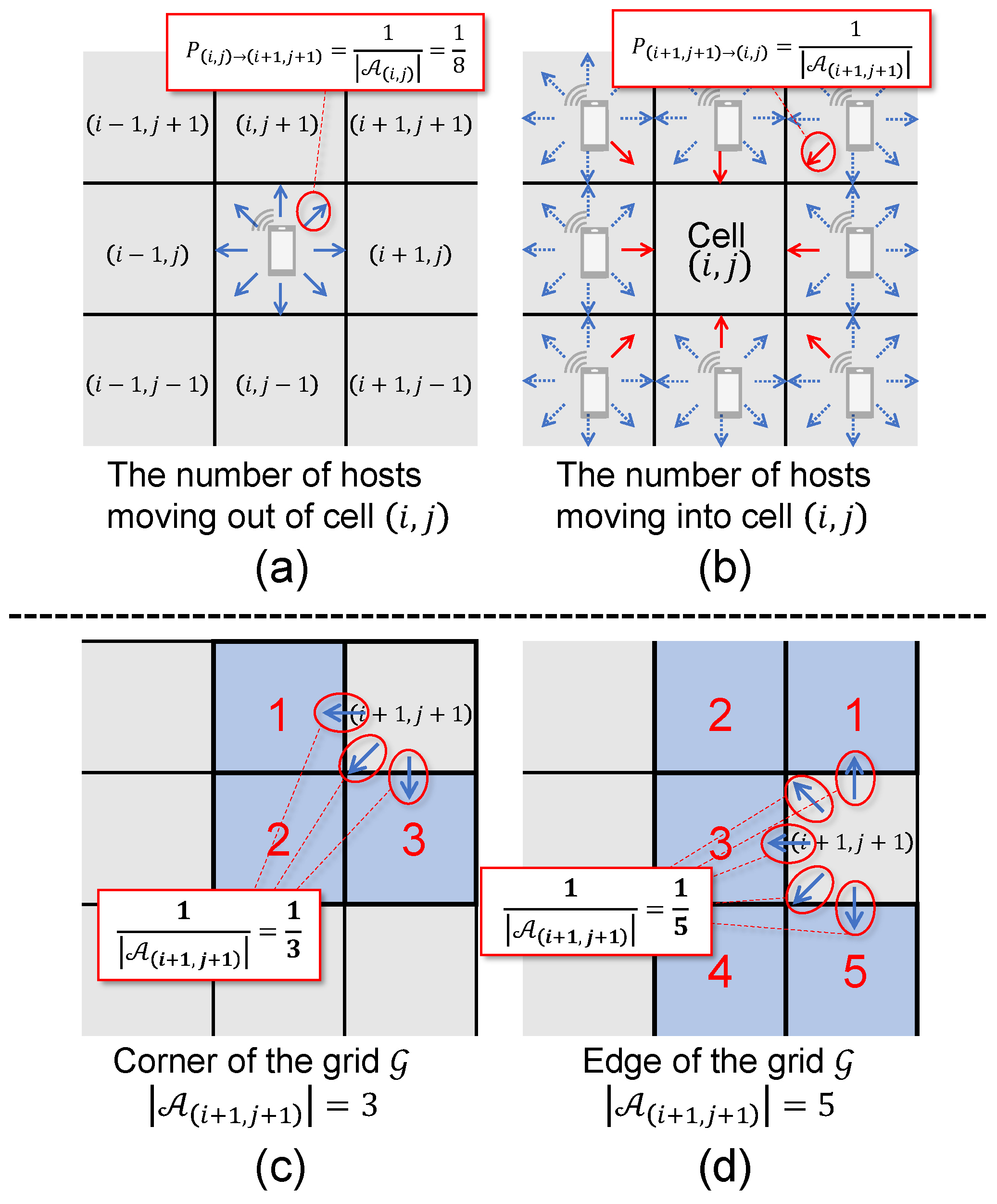 - A host located at cell moves to one of adjacent cells according to a Poisson process with the moving rate . The destination cell is selected based on movement strategies discussed later.