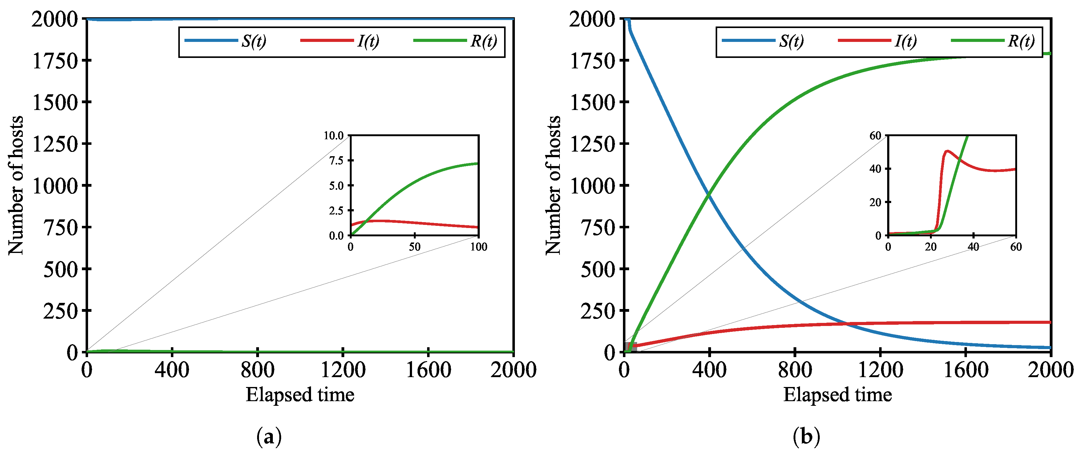 - Xiao, X.; Fu, P.; Dou, C.; Li, Q.; Hu, G.; Xia, S. Design and analysis of SEIQR worm propagation model in mobile internet. Commun. Nonlinear Sci. Numer. Simul. 2017, 43, 341–350. [Google Scholar] [CrossRef]