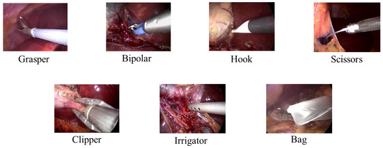 In our experiments, convolutional neural networks were trained to recognize surgical tools, aiming to be deployed in medical applications to improve the efficiency of laparoscopic surgery procedures. The source dataset is the Cholec80 dataset [12]; it contains 80 cholecystectomy videos in which seven kinds of surgical tools are present (see Figure 1). Images containing a single type of surgical tool were extracted to create a derived dataset suitable for the softmax-based single-label classification (see Table 1). In the multi-class classification task, seven types of surgical tools were required to be recognized. Images from the first 40 videos (31,477 images) were used for training, while those from the remaining 40 videos (48,713 images) were reserved for testing. Specifically, images from videos 41 to 45 (7260 images) were designated as an evaluation set to measure the model’s adversarial robustness and feature distribution. The convolutional neural network architecture used for surgical tool recognition was ResNet-50 [13]. ResNet-50 is a popular convolutional neural network used for image classification tasks, and it has four stages of residual convolution blocks, followed by average pooling and a fully connected layer before the softmax activation [13]. Additionally, to explore the generalization and practical applicability of the proposed composite loss, another model architecture—EfficientNet [14]—was employed for an extended experiment. EfficientNet has a baseline network architecture that is finalized by a pooling layer, a fully connected layer, and a softmax layer, with the compound scale method applied to scale it up [14].
