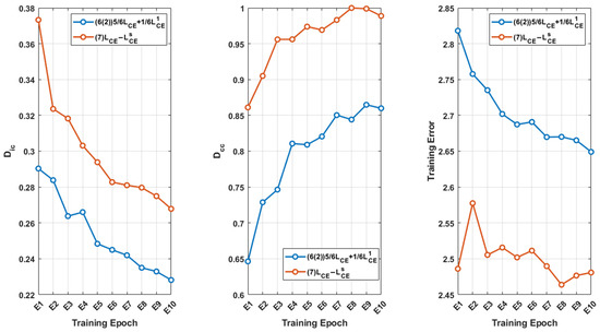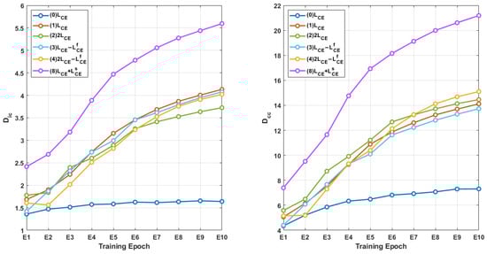 As shown in Figure 2, a continuous increase in both intra-class and inter-class distances within the training-set feature space is observed. The learned feature spaces are noticeably sparser compared to when using standard cross-entropy with a constant learning rate. The two types of learning rate used for training—constant and iteratively decaying—led to different outcomes when applied to standard cross-entropy. In particular, the composition incorporating Shannon entropy achieved the highest intra-class and inter-class distances; this composite cross-entropy loss function encourages further optimization and promotes a more separable and structured feature distribution.