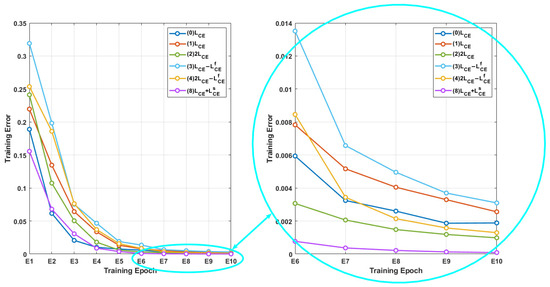 The error on the entire training set at different training epochs is shown. At earlier stages of training, the models trained with composite cross-entropy have larger errors than the model trained with standard cross-entropy. The error of the model trained with becomes the smallest after the 5th epoch (right).