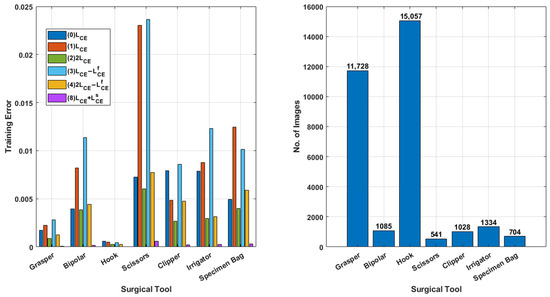 The error for each class (surgical tool) in the training set at the 10th epoch (left). The number of images for each class (surgical tool) in the training set (right).