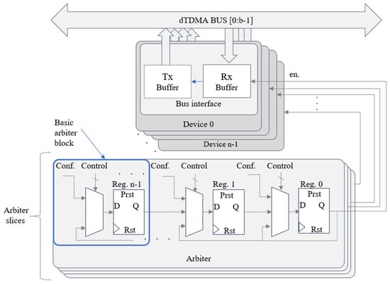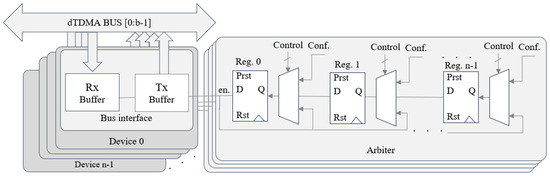 In the implementation of today’s System-on-Chip (SoC) and Network-on-Chip (NoC) designs, shared communication buses and their arbiters function as essential building blocks. Efficient arbitration for shared communication resources is paramount in these designs, directly impacting system performance metrics like latency and throughput [1,2]. Whereas conventional arbitration schemes such as fixed-priority, round-robin, crossbar switches, or static Time Division Multiple Access (TDMA), present various trade-offs concerning simplicity, efficiency, determinism, and cost [3,4], dynamic TDMA (dTDMA) offers a compelling balance for equally distributed loads. By dynamically allocating time slots based on real-time demand, dTDMA can achieve a more efficient bus utilization and responsiveness compared to other static schemes, without the overhead of static approaches or crossbars switches, making it suitable for systems with variable traffic patterns [5].