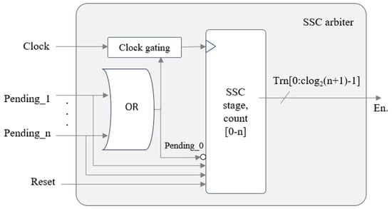 The SSC arbiter implementation uses clock gating logic that disables counting when no devices request data transmission. Note this is a functional requirement and in this scope the clock gating is not only intended for power consumption reduction. This logic is shown in Figure 3. Devices assert the corresponding bit in the Pending_n vector to indicate the presence of data in their output FIFOs.