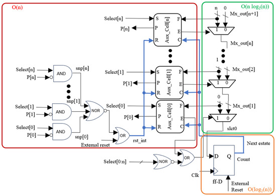 The core component of the proposed dTDMA arbiter, is the SSC stage shown in Figure 4. This block operates as a binary, configurable, in-order counter ranging from 0 to n. From an external perspective, it differs from a traditional counter due to the inclusion of additional selection inputs, labeled select in Figure 4, which correspond to values from 0 to n. When asserted, these inputs define the custom sequence the counter will follow. If no selection inputs are active, the counter output (labeled count in the figure) remains at zero. The count output provides the Trn[0:clog2(n + 1) − 1] after being decoded, where c log is the ceiling of log2 function. The internal structure of the auxiliary cells (Aux_cell) used in the SSC is shown in Figure 5. There are n + 1 auxiliary cells in the design, one for each possible value in the counting sequence plus the rest state.