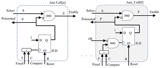 Each time the current count matches the fixed input F of an auxiliary cell (i.e., the cell’s ID), the internal flip-flop is set, indicating the item has been counted. Consequently, the enable output is de-asserted, and the next item in the sequence can be captured on the next positive clock edge. Once all selected items have been processed, all auxiliary cells are reset to initiate a new sequence.