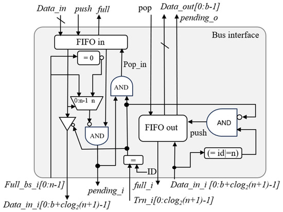 Implementation of the bus interface in Figure 2. The data bus width b defines the flit size.