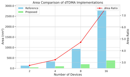 To assess the scalability of both dTDMA implementations, synthesis was performed for varying numbers of connected devices: 2, 4, 8, and 16. In this study, each connected device is implemented with FIFOs that emulate data traffic through the bus. This parametric analysis allows for an understanding of how the area requirements of each architecture evolve as the complexity of the system increases. The quantitative results of this area comparison are summarized in Table 1 and visually represented in the bar chart of Figure 7, providing both tabular and graphical insights into the area efficiency of the proposed design versus the reference implementation.