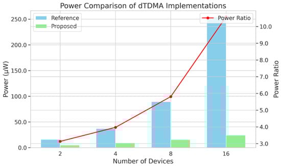 The captured waveform data was subsequently processed to generate a Switching Activity Interchange Format (SAIF) file. The SAIF file contains statistical information about the switching frequency of each node in the circuit, providing a realistic profile of the design’s dynamic behavior. This SAIF file was then imported back into Synopsys Fusion Compiler during the power analysis phase. By applying these activity factors, the power estimation closely reflects the actual power dissipated during typical operation. To ensure a fair and consistent comparison, the exact same UVM-based verification testbench and the resulting SAIF files were used for power analysis of both the proposed and the reference dTDMA implementations for each system configuration (2, 4, 8, and 16 devices, each with a 64-bit flit width). The multiple power reports generated for each configuration were then compiled and are presented in Table 2 and visualized in Figure 8, allowing for a direct comparison of the power efficiency of the two approaches across different system sizes. The analysis of the results demonstrates a significant advantage of the proposed design in terms of both area and power. The reference design exhibits a non-linear, close to quadratic, increase in area with the number of devices, which is attributed to its underlying architectural scaling where both the horizontal and vertical dimensions of the bus expand with each added device. In contrast, the proposed solution demonstrates a much more favorable nearly linear growth in area, leading to a considerably smaller physical footprint, especially as the number of connected devices becomes larger. This difference in area scaling has profound implications for the scalability of the system, with the reference design becoming increasingly area-inefficient for larger-scale integrations.