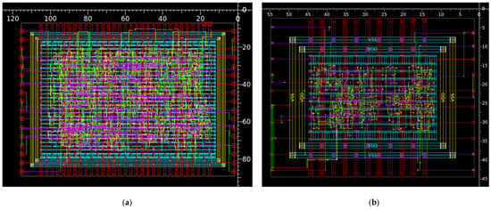 Comparative Layout view for 16 devices connected: (a) for the reference implementation, and (b), for the proposed architecture. Dimension scales in the layout views are in um.