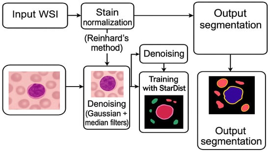 To overcome the limitations of both pixel-based and bounding-box-based models, newer architectures such as StarDist were proposed [7,8]. StarDist formulates segmentation as a shape-aware regression problem by modeling objects as star-convex polygons. This approach allows for more accurate delineation of irregular and overlapping cell structures. Empirical studies have demonstrated StarDist’s effectiveness in segmenting nuclei and cells in 2D and 3D microscopy images, offering higher precision and improved boundary adherence compared to classical deep learning models [8]. Unlike earlier applications of StarDist in cell tracking or 3D segmentation, this study focuses on densely packed WBCs in WSIs characterized by staining variability and irregular morphologies.