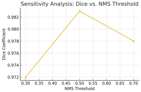 We extended our sensitivity sweep for τ from 0.5 to 0.95 (step 0.05) and NMS thresholds from 0.3 to 0.7. Figure 3 includes curves, demonstrating that optimal performance is maintained for τ ∈ [0.65,0.80] and NMS ∈ [0.45,0.60]. Beyond these ranges, recall drops significantly, underscoring the need for careful parameter selection in clinical deployments.