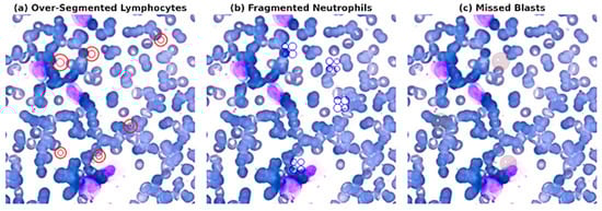 Representative failure modes in WBC segmentation. Figure shows three typical segmentation failure scenarios observed during evaluation: (a) Over-segmented lymphocytes caused by ambiguous nuclear boundaries, (b) highly fragmented neutrophils due to lobulated nuclei and poor cytoplasmic contrast, (c) missed blast cells in regions with heterogeneous staining or overlapping structures. These examples highlight limitations in standard segmentation approaches and motivate the integration of refinement strategies such as SAM2 and self-attention mechanisms (see Table 6).