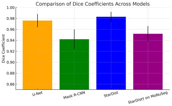 Comparison of Dice Coefficients across segmentation models. Plot shows mean Dice coefficients with standard deviation error bars for U-Net, Mask R-CNN, StarDist, and StarDist (evaluated on MoNuSeg dataset). StarDist achieved the highest Dice score (0.983 ± 0.009), followed by U-Net (0.976 ± 0.012), while Mask R-CNN showed lower performance (0.942 ± 0.018). Corrected axis labeling and data reflect numerical values reported in Table 2.