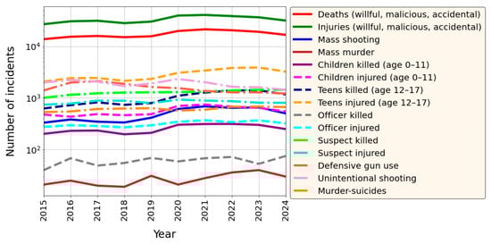 - The Gun Violence Archive. Available online: https://www.gunviolencearchive.org/ (accessed on 18 June 2025).