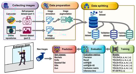 After labeling the collected images, the first part was additionally subjected to augmentation. After combining the augmentation results with the second part of the images, a complete dataset was obtained. Next, this set was randomly divided into training, validation, and test parts. The training and validation subsets were used to build models, and the test set was used to evaluate them. The best model, recommended for application, was used to predict new images when detecting dangerous items at the entrance to the monitored room.