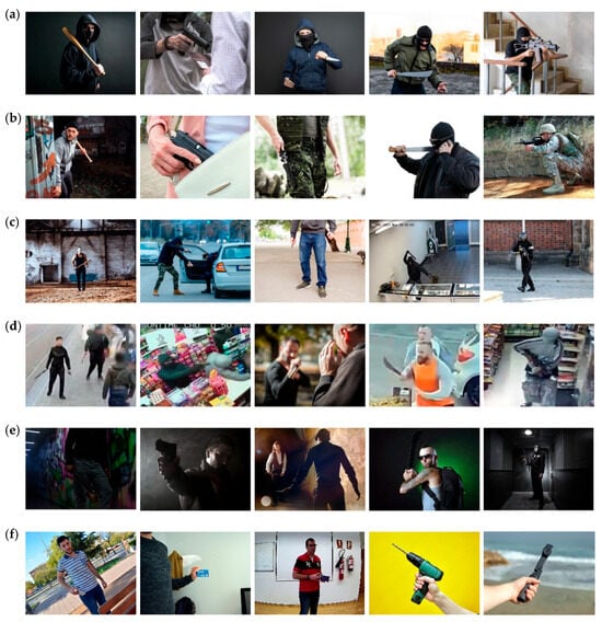 The second part of the dataset used to build the models consisted of 4478 images collected from publicly available online repositories. This part of the dataset presented detected items in various conditions and situations, which allowed for increasing the generalization capabilities of the built models. The dataset in question was built by the author as part of the research presented in [13]. It can be divided into several categories of images, examples of which are shown in Figure 4. These images were also annotated using the YOLO standard. The second part of the dataset also includes 826 background images, which are intended to reduce the number of false positive detections.