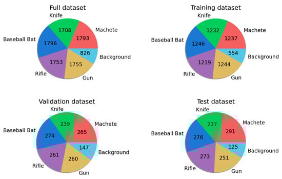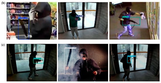 It is important to note that each item detector model is built for a specific application. This application determines the content of the training image set. If the detector is intended to detect dangerous items being brought into a building (e.g., a school), a sufficiently representative set of images presenting the detected items in this specific location must be collected. For this reason, a two-part dataset was used in this study. The first part was recorded independently near the entrance to the monitored room. The collected images presented 5 potentially dangerous items in various shots, such as a machete, knife, baseball bat, rifle, and gun. Images were recorded at 15 FPS using a Tracer HD WEB008 webcam (Megabajt Sp. z o.o., Warsaw, Poland) acting as a surveillance camera and a computer system with the following specification: a laptop with Windows 11 64-bit operating system, Intel Core i7-12650H 2.70 GHz processor, and 32 GB RAM. Every 30th frame was cut from the recorded video material, resulting in an extensive collection of images presenting various items. In the next step, the images were annotated in the YOLO standard using the Label Studio environment.