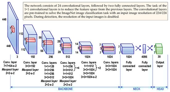 The YOLO model consists of three parts: the backbone, the neck, and the head. The backbone consists of convolutional layers used to detect key features of the image and process them. The model’s construction begins with the preliminary training of the network backbone using a dataset intended for image classification. The backbone is trained at a lower resolution than the final object detection model because detection requires more image details than classification. In the original YOLO model, the backbone was pre-trained on the ImageNet dataset containing images divided into 1000 classes. The Darknet framework was used for training [31]. The training includes 20 convolutional layers, followed by an average-pooling layer and a fully connected layer. During detection, four additional convolutional layers and two fully connected layers are added to the pre-trained network to increase the model’s performance (Figure 6).
