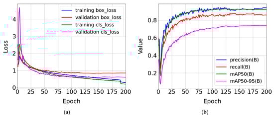 The neck uses fully connected layers and, based on features derived from the backbone mesh layers, determines the prediction confidence and the coordinates of the bounding box. The head, on the other hand, is the output layer of the network, which can be interchanged with other layers with the same input shape to implement transfer learning. As stated in the source material, the head is formed by a tensor with the shape S × S × (B × 5 + C) [31]. The size of the grid into which the input image is divided is 7 × 7 (S = 7). The number of detected classes is 20 (C), and 2 bounding boxes (B) are predicted in each cell. It can therefore be seen that the final prediction is expressed by a tensor with a size of 7 × 7 × 30. The three parts of the model described above work together first to extract key visual features from the image and then classify and link them.