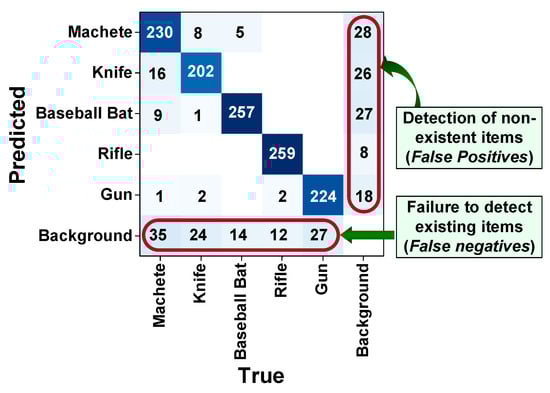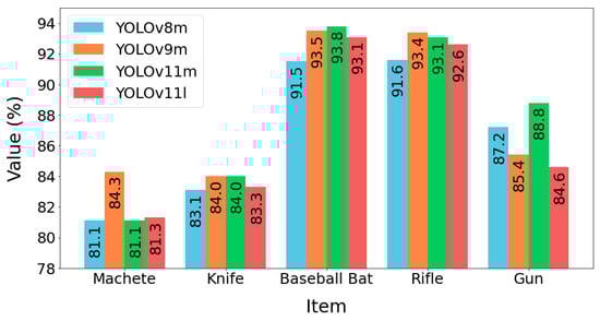 Table 5 summarizes the results of dangerous item detection obtained by other authors. The first 10 rows of this table present the results obtained using YOLO networks. First, it should be noted that most studies conducted using these networks focus on the detection of firearms, especially guns. The best detection recall for this type of item was achieved by Ashraf et al. (99%) [50], followed by Shanthi et al. (95%) [51], and in third place by Yadav et al. (91.4%) [52]. The recall obtained in this study (88.8%) is lower than those mentioned above, but it is still high and exceeds the results obtained by other authors listed in Table 5. The precision of gun detection obtained by other authors exceeds 90% in most cases, with the best result obtained by Bushra et al. being 98% [53]. The author’s own result, equal to 90.5%, is lower, but nevertheless satisfactory and exceeds the results of other authors. As for the precision of knife detection, Sun et al. obtained a result of 57.2% [54]. Own results in this case are significantly higher, at 84.4%. Unfortunately, there are no results available to compare the detection recall of other types of dangerous items, such as machetes, baseball bats, and rifles. Comparing mAP values is not easy, as it determines the average precision for all detected classes. Against this background, own dataset is more complex, as it contains five classes of different items. In contrast, the datasets used by other authors are simpler and more limited in this respect, as they usually contain only guns or only several types of firearms. Furthermore, the datasets used by other authors are often limited in number, and the authors do not provide information on the quality of the images they use (blurring, poor lighting, small items, etc.). In this context, own mAP result (91.8%) seems particularly good.