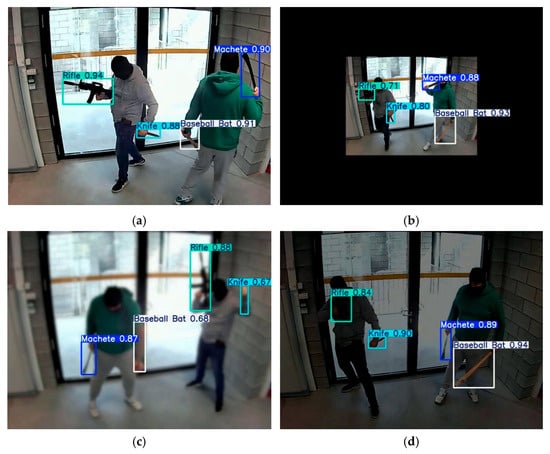In normal visibility conditions, all items were detected correctly. Similar high model effectiveness was observed when the image size was reduced by 50% (smaller items). In the case of poorer image sharpness, larger items (rifle, baseball bat, machete) were detected quite well, while there were problems with detecting smaller items (knife). Finally, with reduced lighting (darker items), the effectiveness of item detection was like before. During the tests, there were periods when a given item (especially a small one, such as a knife) was not detected, but these were so short that they did not affect the high rating of the effectiveness of detecting the presented items. The images were recorded at a resolution of 1000 × 750 pixels using the same computer system that was used to collect the first part of the dataset. The technical parameters of this system allowed for smooth display of prediction results at a speed of up to approximately 60 FPS. This situation shows that the YOLOv11m model can be easily integrated into typical general-purpose computer systems. Selected excerpts from the course of the experiment are shown in a video made available on the Zenodo platform (https://doi.org/10.5281/zenodo.16498782).