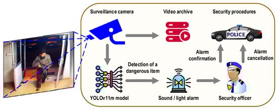 In recent years, we have seen an increase in the number of cases of violence involving several types of weapons. This trend is clearly illustrated by data published by the Gun Violence Archive, according to which the number of incidents involving weapons has been steadily increasing in the U.S. over the last decade (Figure 1). The persistently high number of such cases shows that contemporary public safety challenges, related to the dynamic growth of crime involving dangerous items, require a revision of traditional monitoring methods. The key problem remains the limited effectiveness of human surveillance. Research shows that monitoring operators can effectively observe a maximum of four cameras at a time, and their concentration drops after just 20 min of continuous work. This leads to situations where dangerous items appearing in the camera’s field of view go unnoticed. One way to solve this problem may be to use deep neural networks. They enable the automatic detection of potential threats in public places such as schools, airports, train stations, or any other places where large groups of people gather. The system for detecting such items can operate in real time, using ready-made video surveillance systems that are usually already available in the aforementioned locations. This means that implementation does not have to involve additional costs and can significantly improve safety and enable the rapid notification of threats in a given public place.