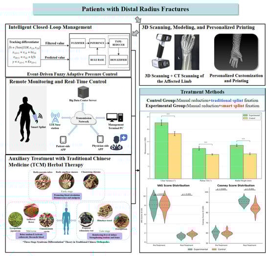 This study details the design and preliminary validation of a smart, IoT-enabled splint, showing its potential therapeutic advantages over conventional splinting for distal radius fractures. Our results suggest that the integrated intelligent treatment protocol can achieve statistically superior anatomical restoration and functional recovery. This was highlighted by the experimental group attaining a mean Cooney wrist function score of , substantially higher than the control group’s (p < 0.001). This enhanced performance is attributed to the splint’s core innovation: a fundamental shift from static immobilization to dynamic, closed-loop biomechanical regulation. By using an integrated system of pressure sensors and servo-actuators to maintain therapeutic pressure within an optimal range, the smart splint directly mitigates critical risks of traditional splinting, such as pressure sores or loss of reduction. In the context of prior research, while studies have explored 3D-printed personalized splints, most remain static devices that improve fit but do not address dynamic physiological changes like detumescence. Similarly, the emerging field of smart orthotics has primarily focused on passive monitoring rather than active therapeutic intervention. Our work advances this field by demonstrating the clinical feasibility of an integrated system that not only senses but also autonomously regulates biomechanical forces. This approach aligns with the broader international clinical trend towards personalized medicine and remote patient monitoring. By enabling continuous, data-driven management outside the hospital setting, the system has the potential to reduce clinical workload and minimize hospital visits, which are key goals in modern value-based healthcare systems.