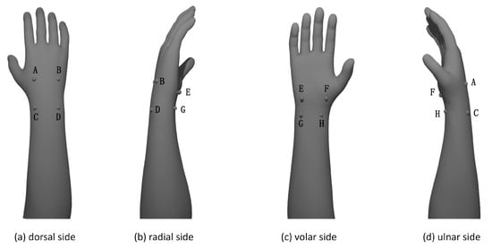 Schematic illustrating the strategic placement of the eight pressure sensors. The specific anatomical locations are as follows: (A) lunate bone (dorsal), (B) triquetral bone, (C) proximal to the fracture line, (D) ulnar styloid process, (E) pisiform bone, (F) scaphoid bone, (G) distal ulna, and (H) radial artery. These sites are shown from four views: (a) dorsal, (b) radial, (c) volar, and (d) ulnar.