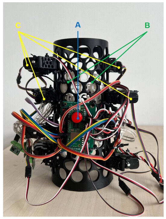 Photograph of the complete smart splint system. Key components are indicated: (A) Integrated PCB Housing, (B) Pressure Sensor Array, and (C) Linear Servo Actuator.